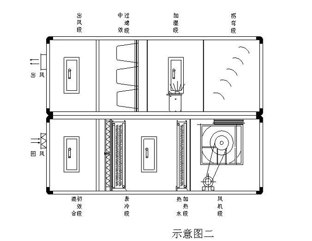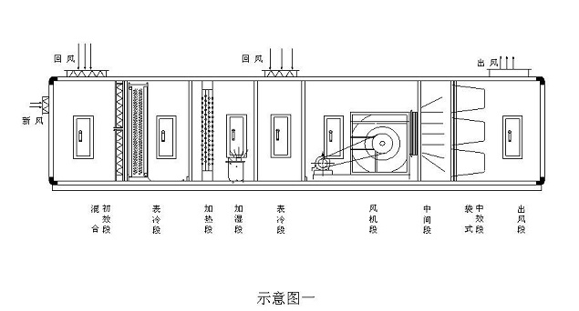 本段起過(guò)渡段的連接和機(jī)組內(nèi)部檢修照明用。在過(guò)濾段前,表冷段、加熱段、消聲段前后均須設(shè)中間段.